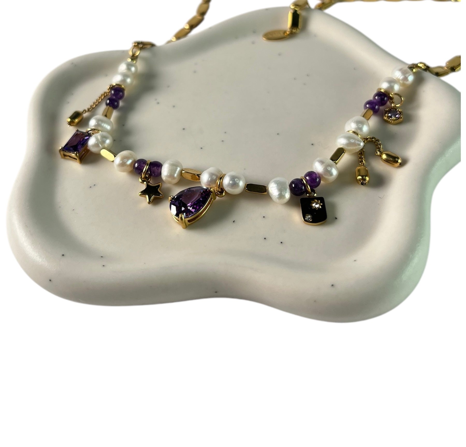 Elegante Edelstahl-Charm-Kette mit Hartvergoldung und Amethyst Lila Steinen