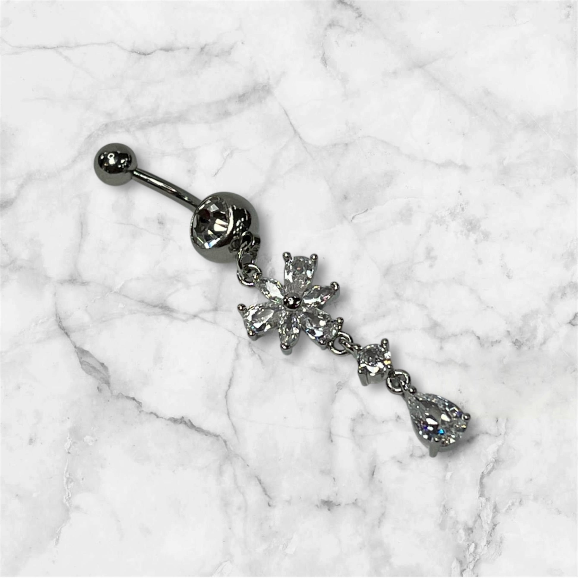 Zart, funkelnd und feminin: Dieses elegante Bauchnabel-Piercing begeistert mit einer filigranen silbernen Blume, verziert mit einem funkelnden Stein in der Mitte. Kleine, beweglich hängende Steinchen sorgen bei jeder Bewegung für ein dezentes Glitzern – ein echter Blickfang für deinen Bauchschmuck.