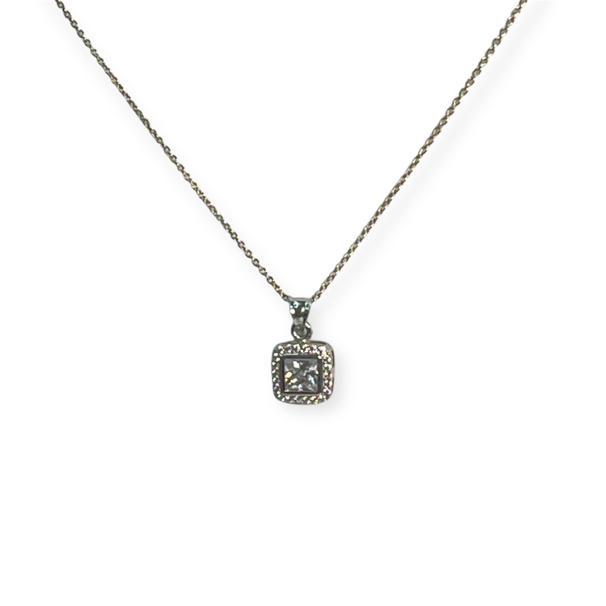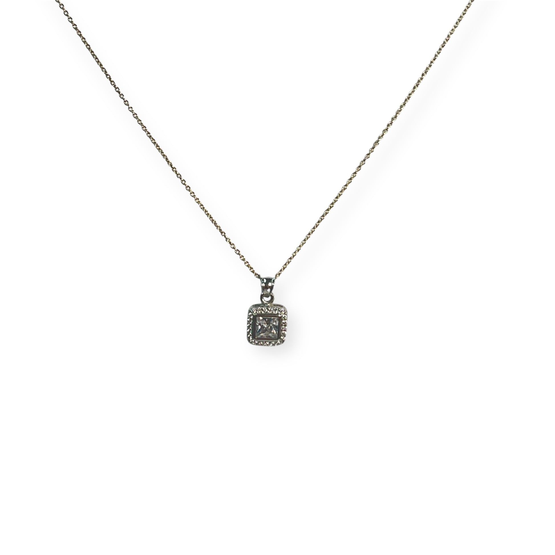 Diese feine Kette aus echtem 925 Sterling Silber trägt in der Mitte einen markanten, quadratischen Anhänger mit einem großen zentralen Stein. Umrahmt wird er von kleinen, funkelnden Steinchen, die das Design strahlen lassen – dezent, aber mit Wow-Effekt. Ideal für elegante Looks mit klarer Linie.