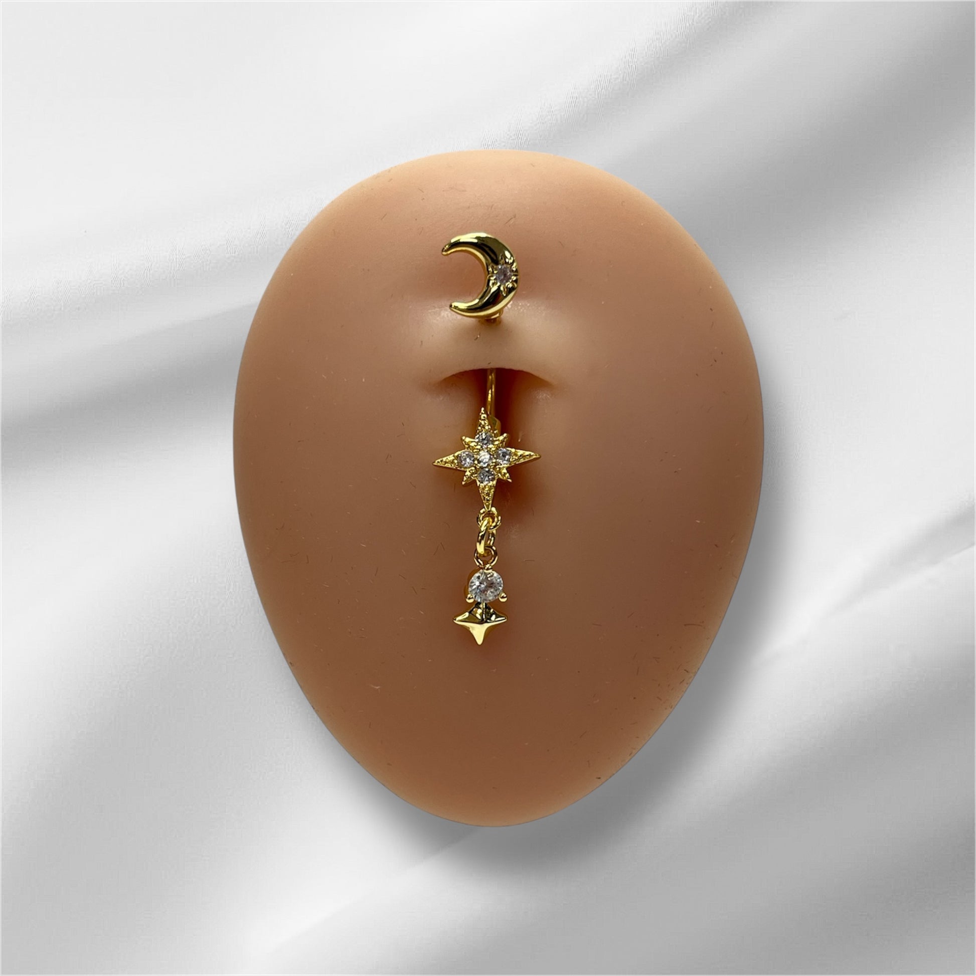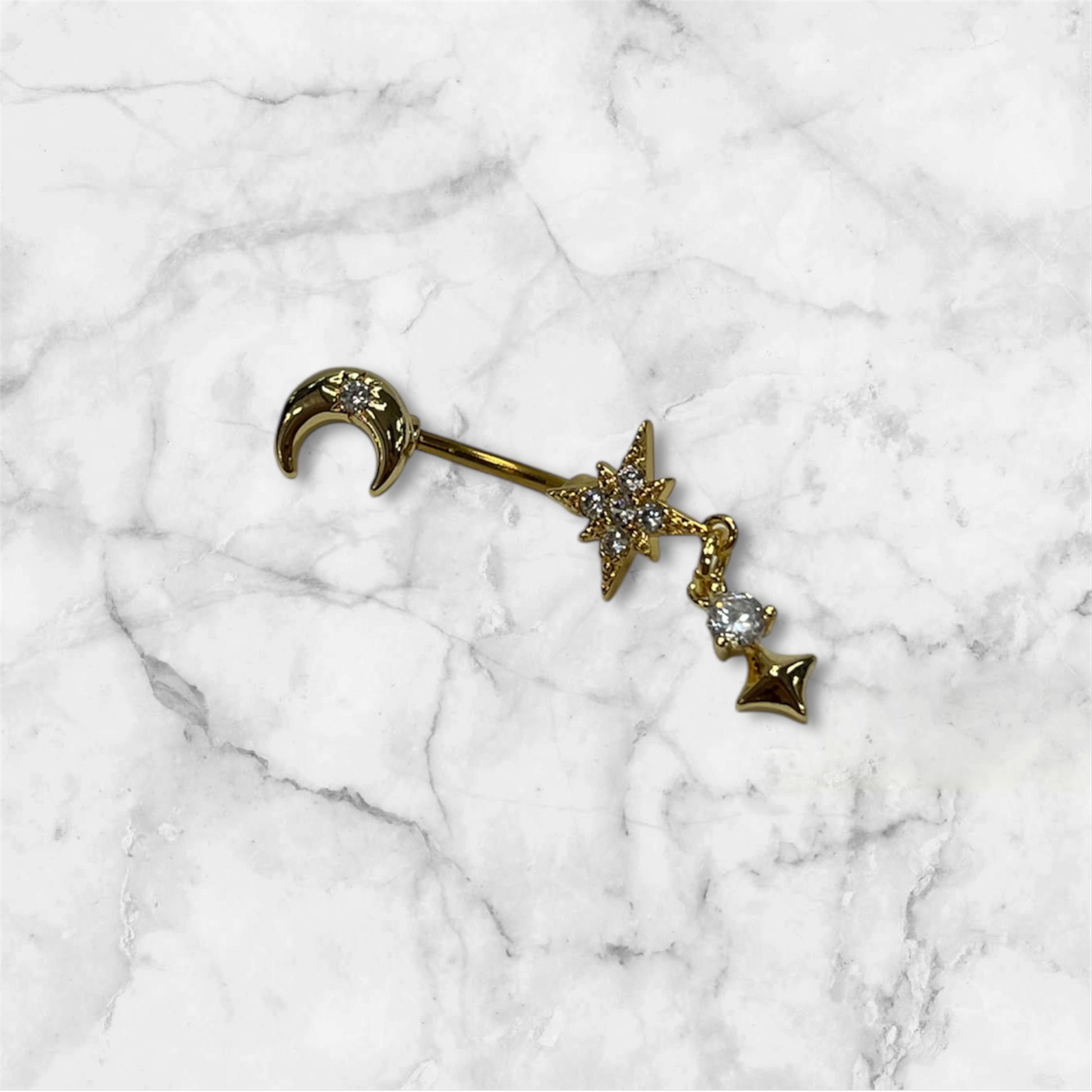 Himmlisch schön: Dieses edle Bauchnabel-Piercing kombiniert einen feinen Mond statt der klassischen Kugel mit einem funkelnden Stern-Anhänger. Ein kleiner, schimmernder Stein hängt zart unter dem Stern und sorgt für einen dezenten, magischen Glanz. Die hochwertige Vergoldung auf Edelstahl verleiht dem Schmuckstück eine warme, luxuriöse Ausstrahlung – perfekt für Träumerinnen mit Stil.
